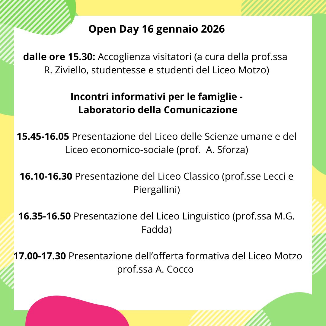 Al Liceo Motzo è nuovamente tempo di Open Day! In allegato è disponibile il programma della serata, che prevede incontri informativi, laboratori didattici e tanto altro! L'evento è rivolto a studenti e famiglie e si terrà dalle 15.30 alle 18.00.