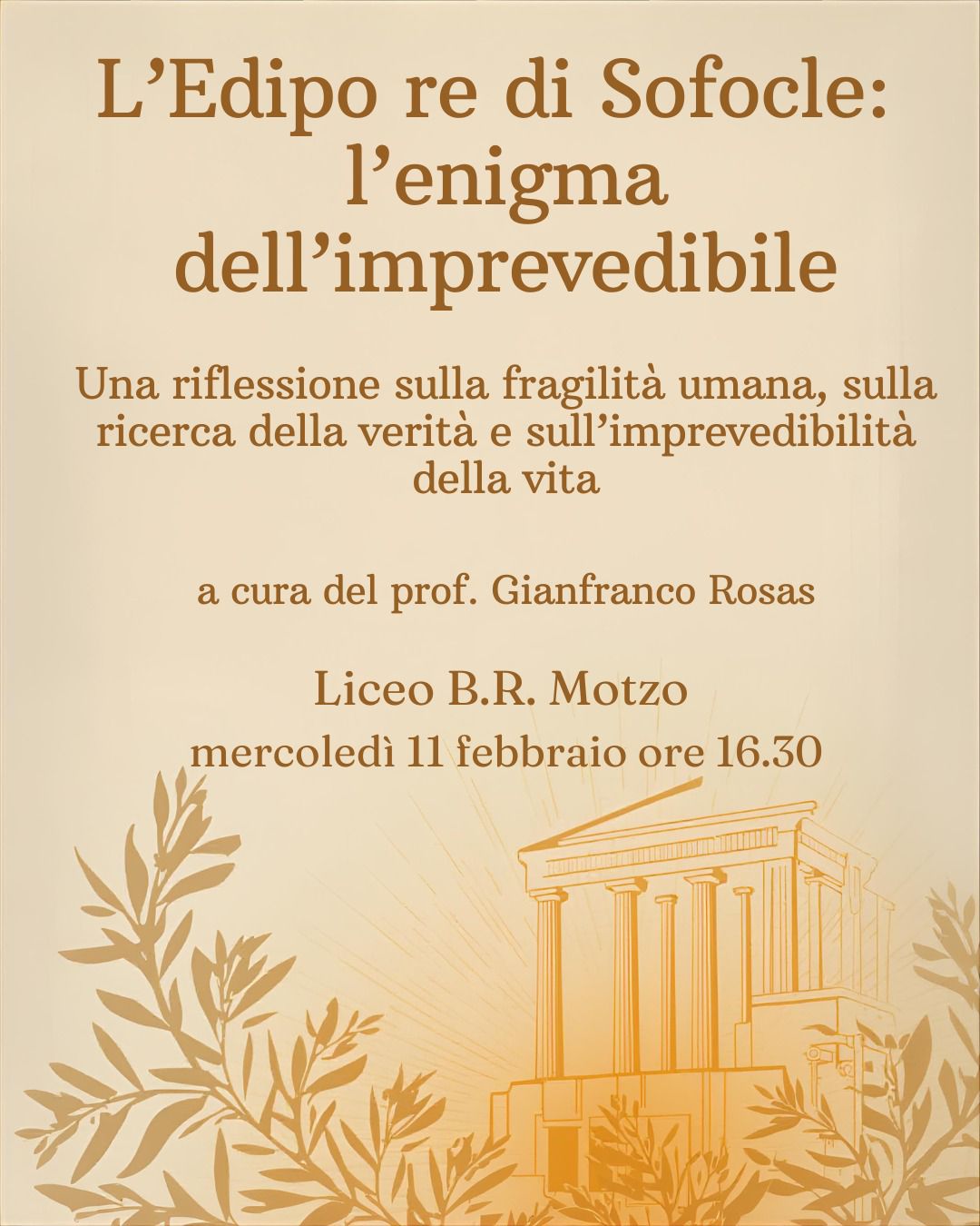La lezione sarà dedicata a una riflessione sulla fragilità umana, sulla ricerca della verità e sull'imprevedibilità della vita, a partire dall'Edipo Re di Sofocle.