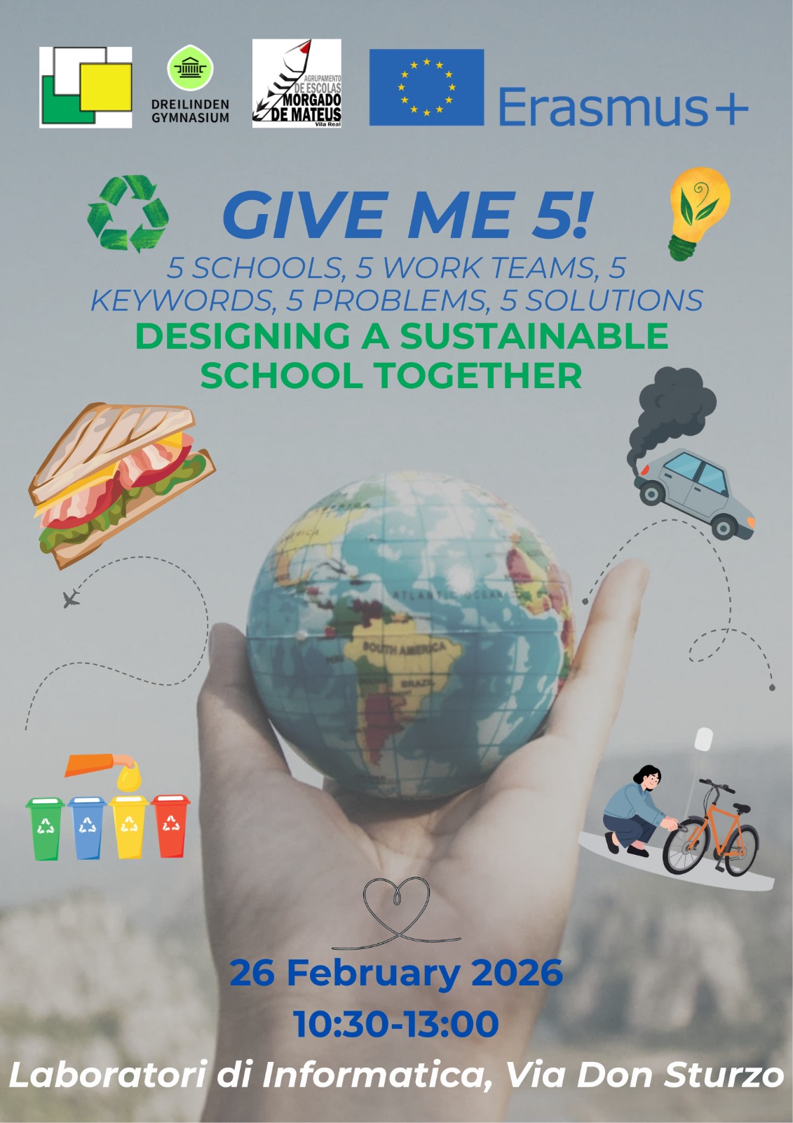 Durante la loro permanenza, la delegazione lusitana e quella teutonica saranno coinvolte in diverse attività, elencate nel programma allegato: tra esse, spiccano la partecipazione alle iniziative Puliamo il mondo, in collaborazione con Legambiente, e il workshop Give Me 5! Progettiamo insieme una scuola sostenibile, come da locandine allegate.